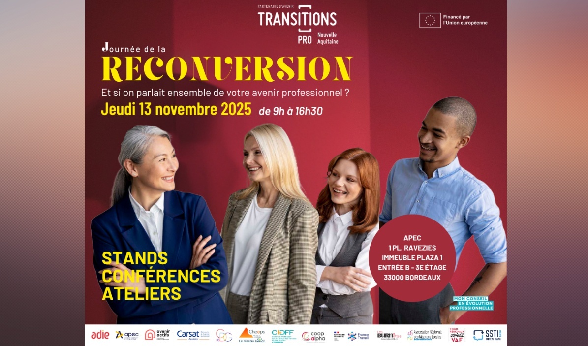 Le jeudi 13 novembre 2025, rendez-vous à Bordeaux pour une journée 100 % dédiée à votre avenir professionnel dans le cadre de la Journée nationale de la reconversion.